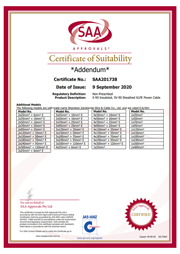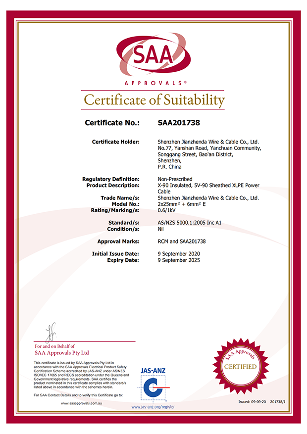 深圳建圳達(dá)電線電纜有限公司,成立于2000年,是一家電線電纜制造商,我們通過了世界各地不同市場的多數(shù)認(rèn)證,如:CCC、RoHS、CB、SAA、TUV、VDE、PSE、BPS、UL、CSA。我們根據(jù)定制產(chǎn)品不斷更新新的認(rèn)證。經(jīng)過數(shù)十年的發(fā)展,我們與來自世界各地的客戶建立了長期的合作關(guān)系。我們曾經(jīng)是菲律賓機(jī)場,,柬埔寨的電力站,美國的醫(yī)院,工廠,埃塞俄比亞的水電站項目。我們是一家值得信賴的電線供應(yīng)商。